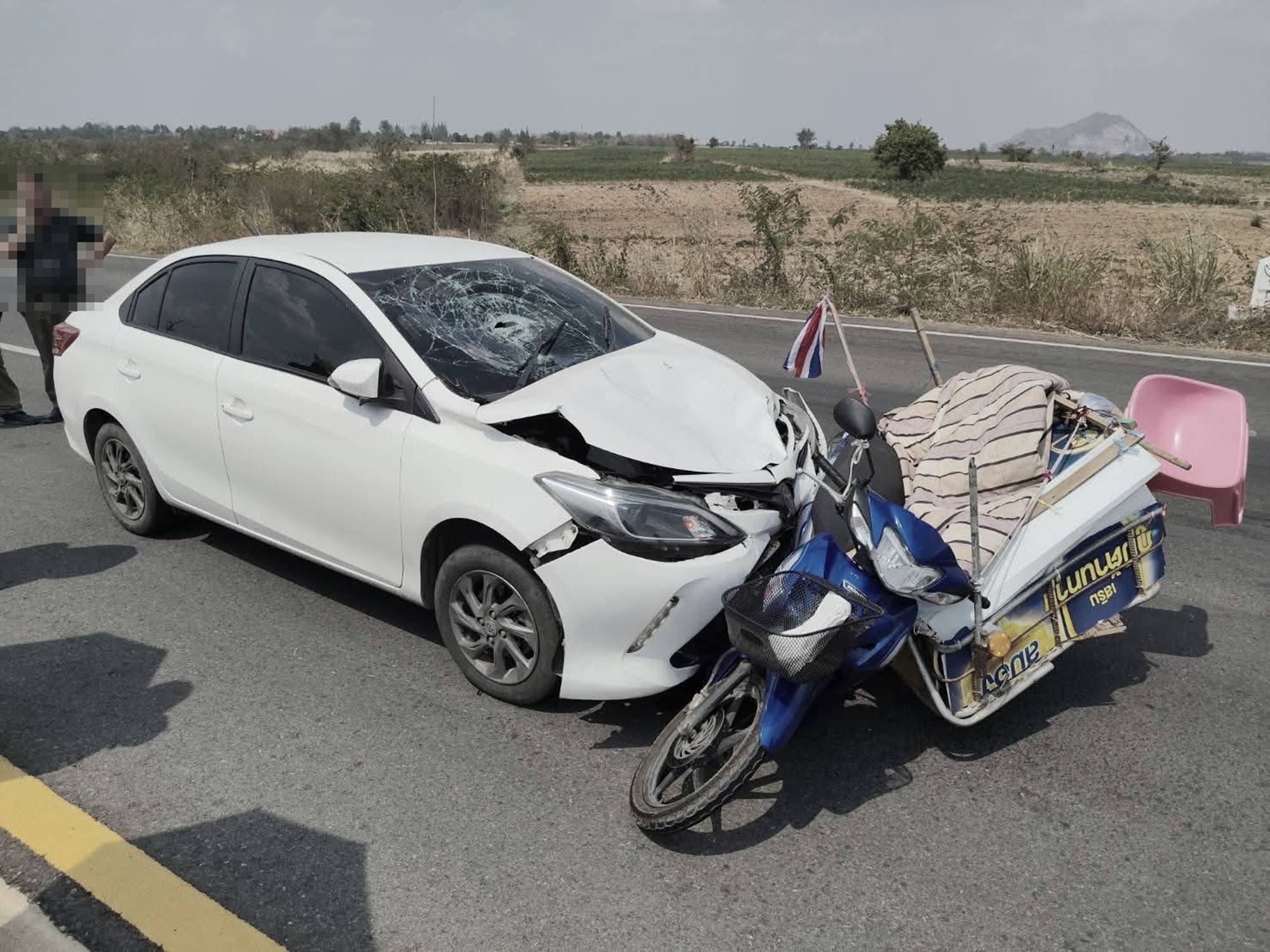 | ที่เกิดเหตุ พบรถจักรยานยนต์พ่วงข้าง ฮอนด้า เวฟ สีน้ำเงิน ป้ายทะเบียน ราชบุรี ลักษณะชนกับ รถนั่งส่วนบุคคล โตโยต้า วีออส สีขาว ป้ายทะเบียน เพชรบุรี