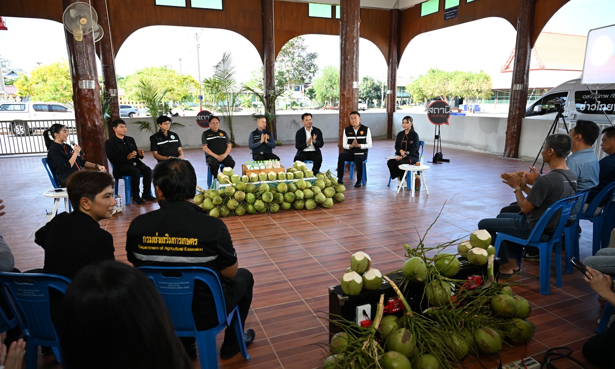 ภาคเช้า: เป็นเวทีสัญจรเพื่อหารือกรณี "ราคามะพร้าวน้ำหอมตกต่ำ" ซึ่งปัจจุบันบางพื้นที่เกษตรกรขายได้เพียงลูกละ 2-3 บาทเท่านั้น แม้หน่วยงานรัฐจะพยายามแทรกแซงรับซื้อในราคาลูกละ 5 บาท แต่ยังกระจายไม่ทั่วถึงและมีข้อจำกัด กลุ่มชาวสวนจึงสะท้อนปัญหาและต้องการเรียกร้องให้รัฐบาลดูแลเสถียรภาพราคาอย่างมีประสิทธิภาพ เนื่องจากมะพร้าวน้ำหอมราชบุรีและบ้านแพ้ว ถือเป็นสินค้าเกษตรคุณภาพสูงที่มีการขึ้นทะเบียนสิ่งบ่งชี้ทางภูมิศาสตร์ (GI)